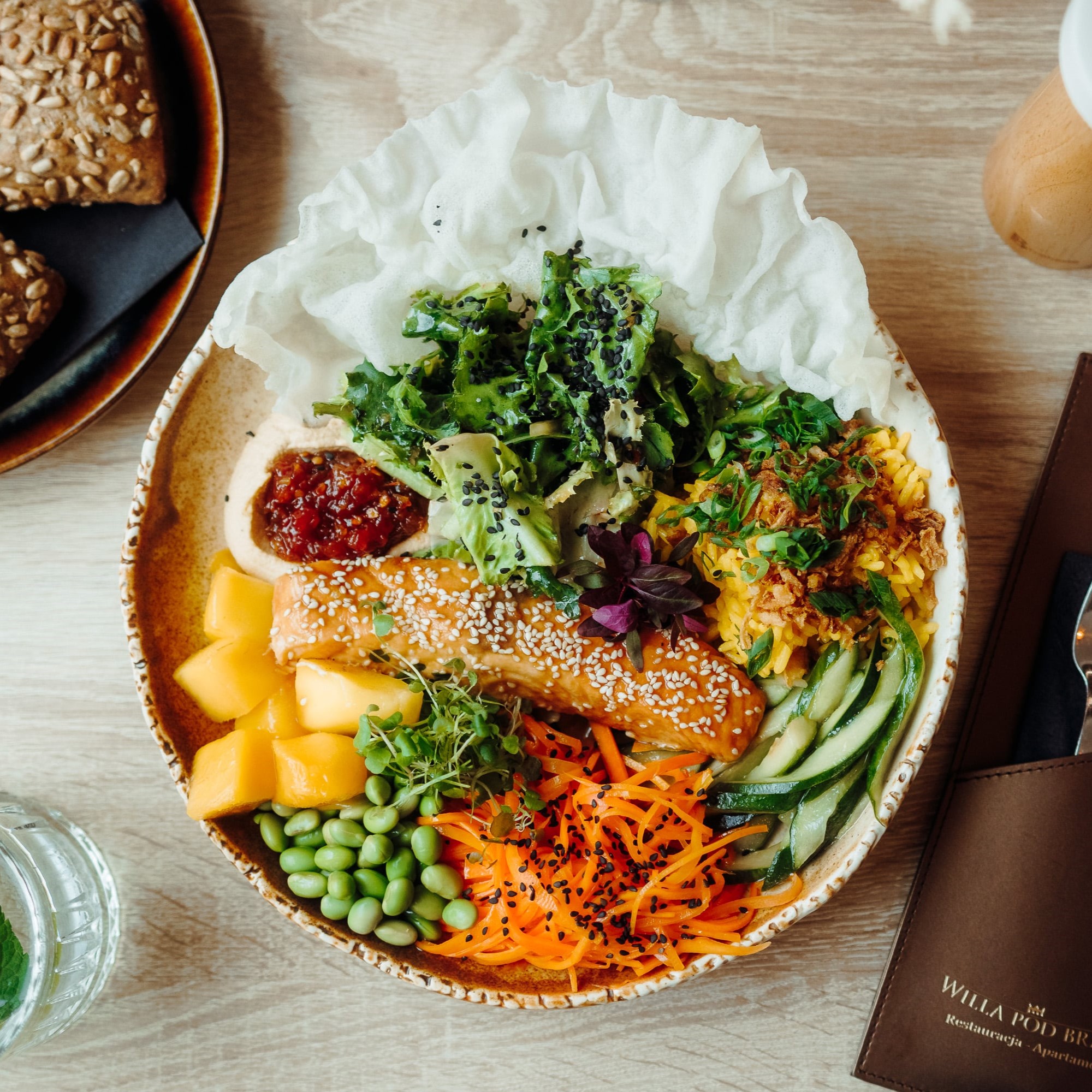 RYŻ | FASOLA EDAMAME | MARYNOWANA MARCHEW | MANGO | MARYNOWANY OGÓREK | MIX SAŁAT | HUMMUS | DŻEM Z POMIDORÓW | CHIPS RYŻOWY | PRAŻONA CEBULA | DRESSING MARAKUJA-CHILLI