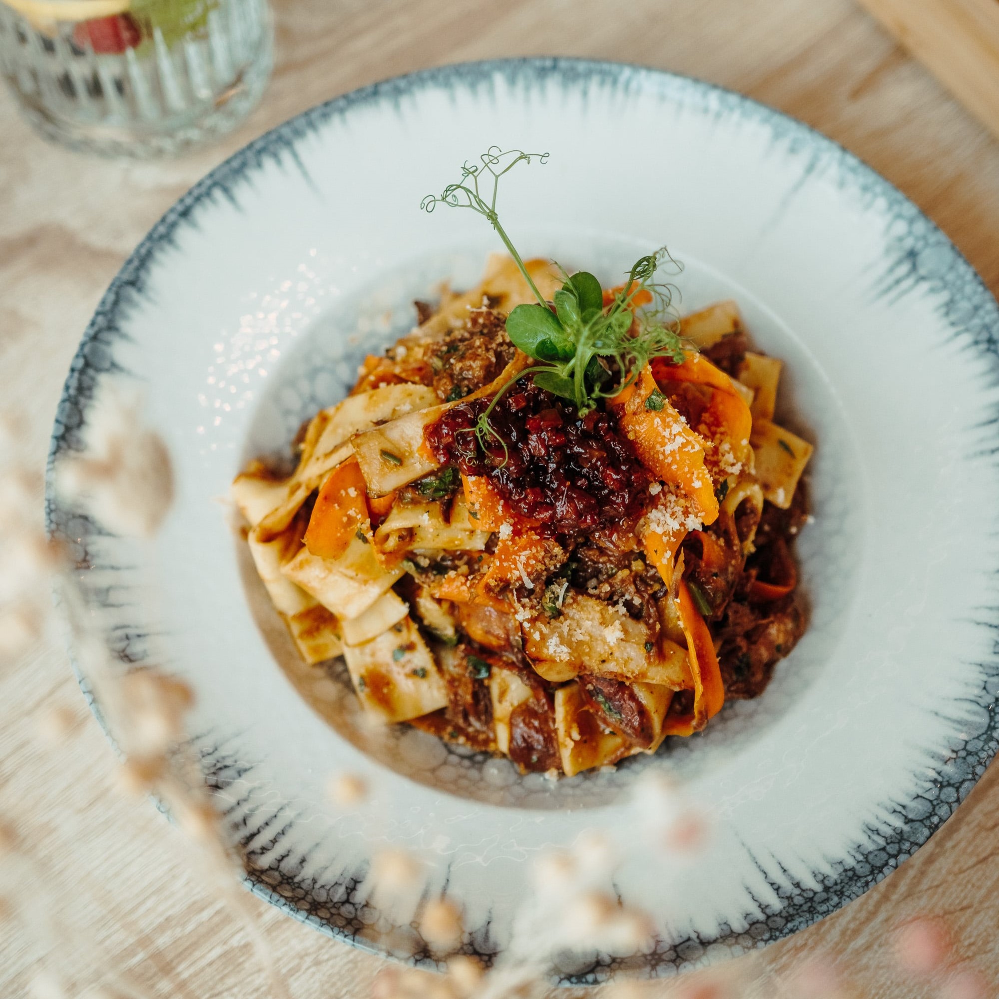 MAKARON PAPPARDELLE | SZARPANA WOŁOWINA | GRZYBY LEŚNE | MARCHEWKA | DŻEM Z CHORIZO | GRANA PADANO